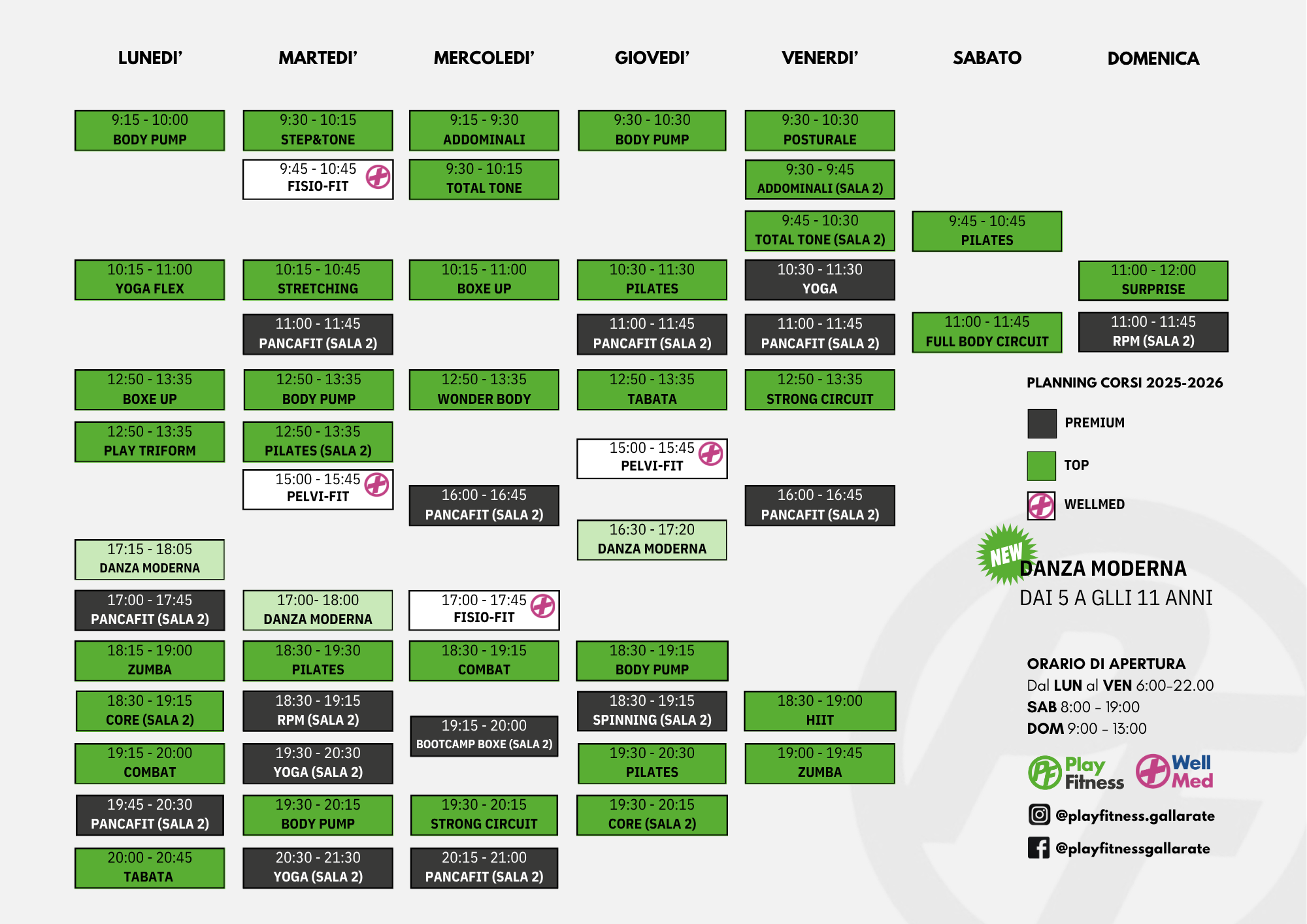 Scopri il programma completo con più di 56 corsi fitness a settimana a tua disposizione: scarica il nuovo planning e allenati nel miglior club di Gallarate e dintorni.